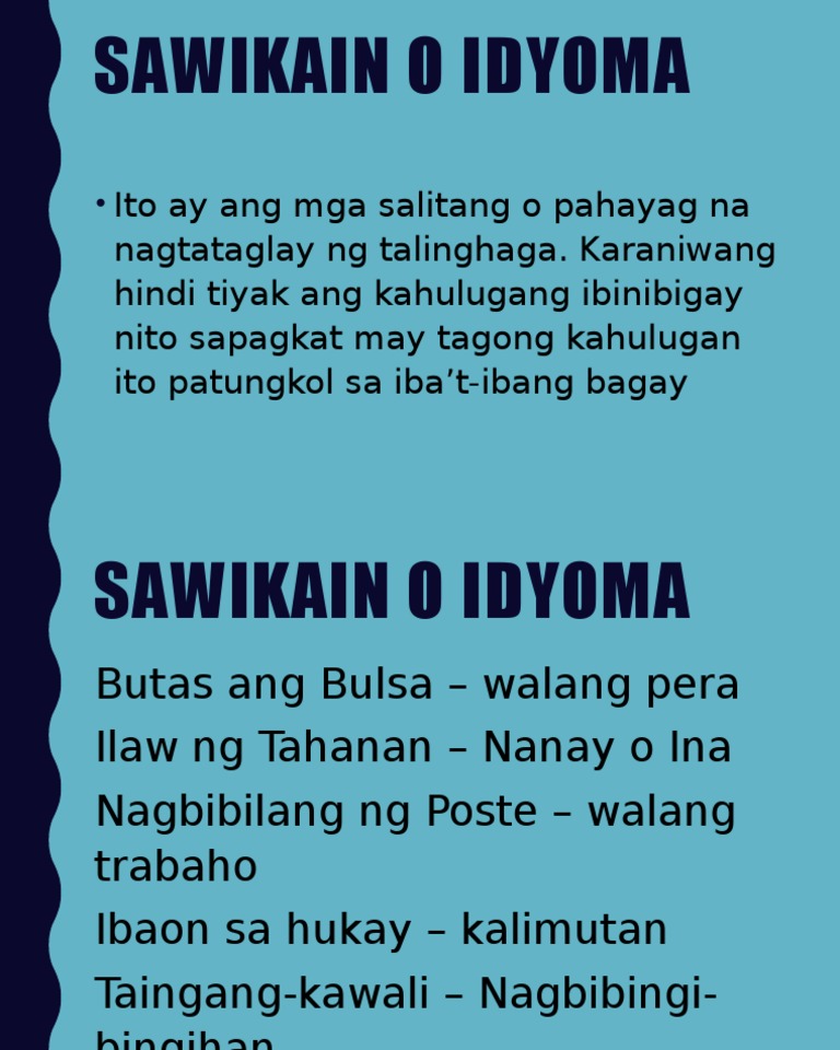 Ang isang sawikain o idyoma ay isang pagpapahayag na ang kahulugan ay hindi komposisyunal sa ibang salita hindi binubuo ng tumpak na kahulugan ang mga kanya-kanyang salita na nabuo. Ang sawikain o idiom sa wikang Ingles ay salita o grupo ng mga salitang patalinghaga na nagsasaad ng hindi tuwirang paglalarawan sa isang bagay kaganapan sitwasyon o pangyayari. Ito ay di-tuwirang pagbibigay kahulugan at pagpapakita ng kaisipan at kaugalian ng isang lugar.