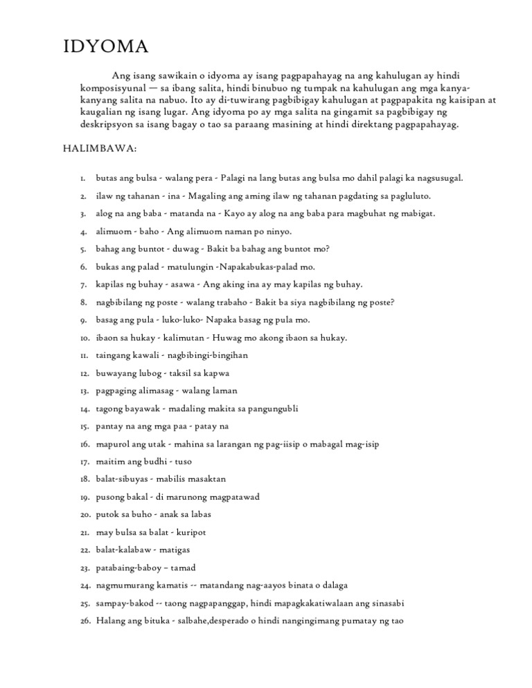 151822745 Ano Ang Idyoma At Mga Halimbawa Docx Idyoma Ang Isang Sawikain O Idyoma Ay Isang Pagpapahayag Na Ang Kahulugan Ay Hindi Komposisyunal U2014 Sa Course Hero