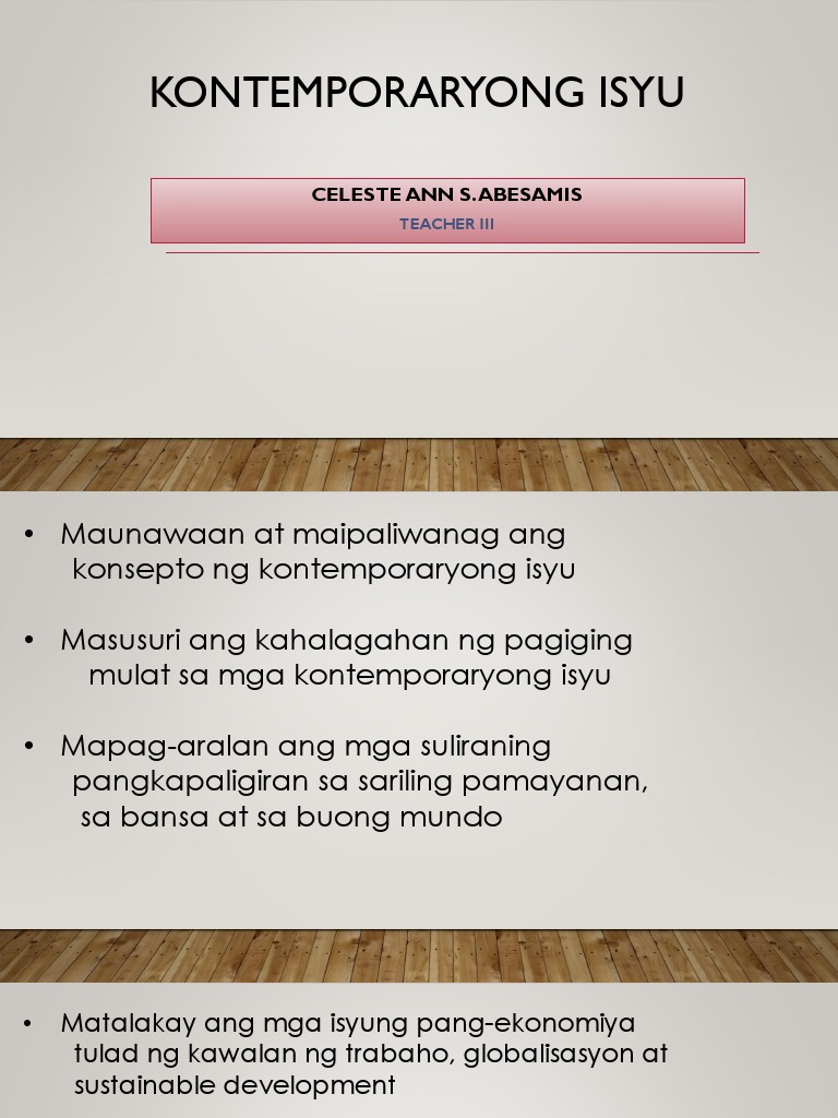 Kontemporaryong Isyu Ang kontemporaryong isyu ay tumutukoy sa anumang pangyayari ideya opinyon o paksa sa kahit anong larangang may kaugnayan sa kasalukuyang panahon. Communion diskrimnasyon talakayan panimula tandaan ang tatlong lasallian core values at kanilang katumbas. Contextual translation of kontemporaryong into English.