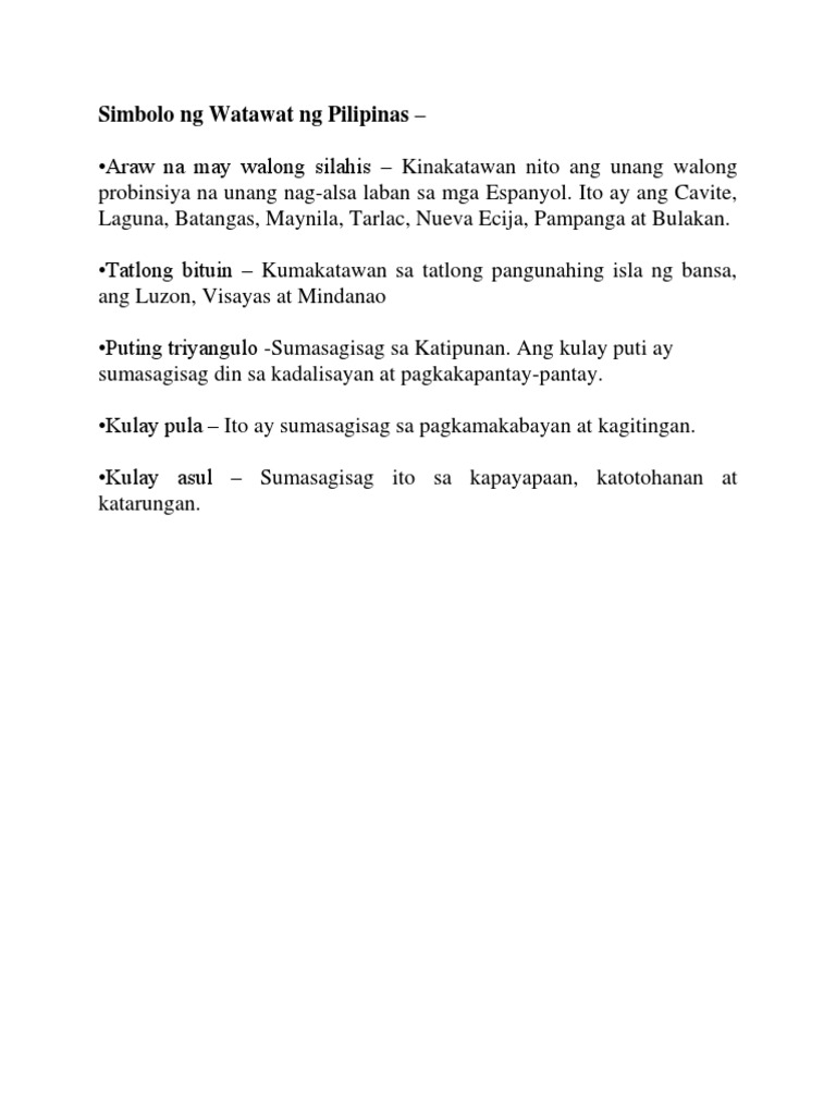 Kahulugan ng mga kulay at simbolo ng watawat ng pilipinas. Isa sa mahalagang simbolo ng bansa ang watawat ng Pilipinas. Tatlo ang pangunahing kulay nito. Ang haba ng kanilang pakpak ay 2 metro o higit pa.