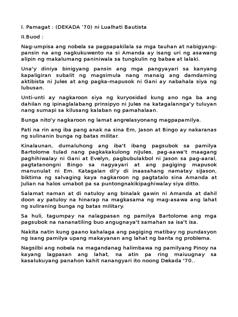 Buod Ng Nobelang Dekada 70 Final