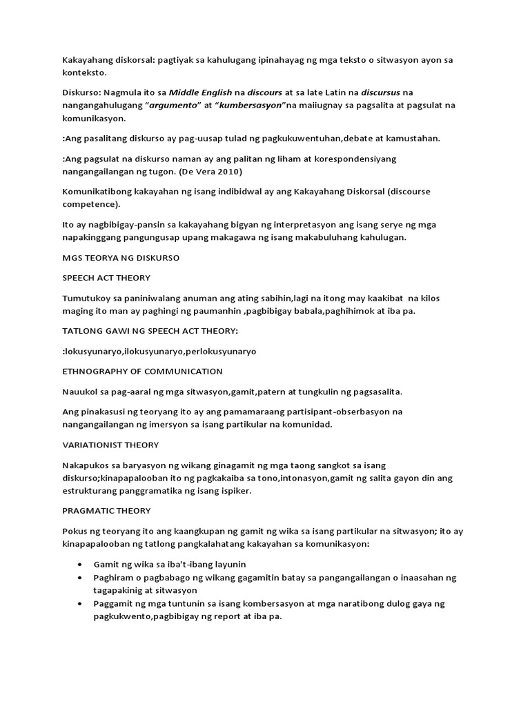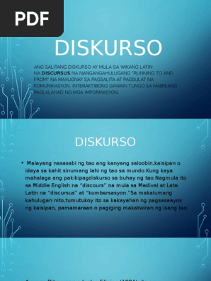 Si Webster 1974 ay may ibat ibang depinisyon para sa terminong ito. View Kakayahang Diskorsalpptx from SOCIAL SCI SOCSCI 1 at University of San Carlos - Main Campus. Ang pasalitang diskurso ay pag-uusap tulad ng pagkukuwentuhan debate at kamustahan.