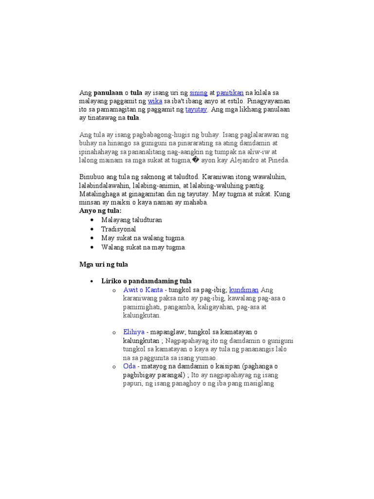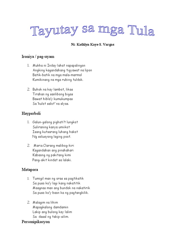The Tagalog word for poetry is panulaan or simply tula poem. Types Kinds of Figures of Speech in Tagalog. Halimbawa Ng Mga Tayutay Sa Tula pqn80ywz1yl1.