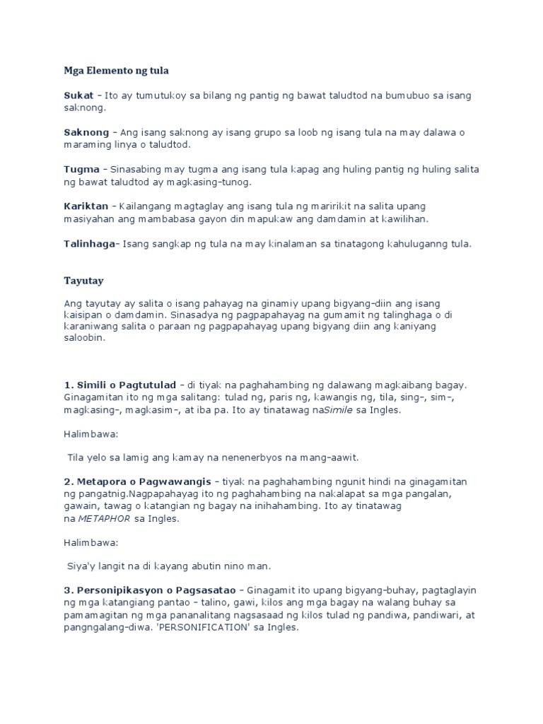 Sinasabing may tugma ang tula kapag ang huling pantig ng huling salita ng bawat taludtod ay magkakasintunog. TAYUTAY Sa paksang ito tutuklasin natin ngayon ang mga iba ibang uri ng mga tayutay at mga halimbawa ng mga uri nito. Mukha ni Inday lahat napapalingon Angking kagandahang tigyawat na lipon Batik-batik na mga mala-marmol Kumikinang na mga rubing tuldok.