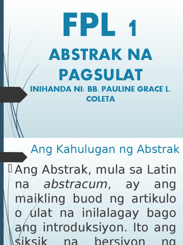 View PPT_FPL-11_12-Q1-0301_Kahulugan-Layunin-at-Gamit-ng-Abstrakpptx from LLB 01 at Liceo de Cagayan University. Thesis paper ang madalas na itawag dito. ABSTRAK Sa usaping pananaliksik thesis o research ang abstrak ay maikling paglalahad ng kabuuan ng isang pag-aaral o pananaliksik.