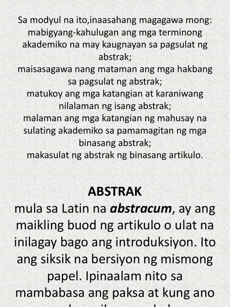 Halimbawa Ng Abstrak Philippin News Collections. Ito ay abstrak tungkol sa mga teknik na ginagamit ng sangka-estudyantehan para makapag-aaal ng husto. Pagsulat ng Abstrak Aralin 1 Kahulugan Layunin at Gamit ng Abstrak Ang.
