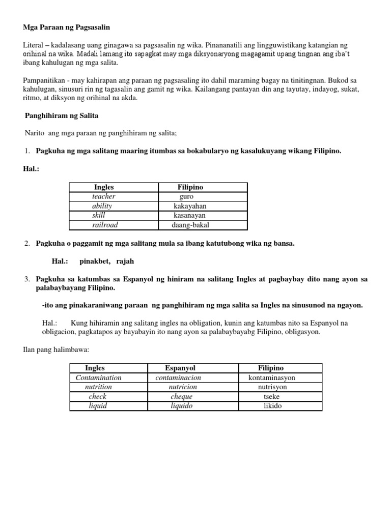 Literal Sa metodong ito ang estruktura ng SL ang sinusunod at hindi ang natural at mas madulas na daloy ng TL at kadalasan ding ang pangunahing katuturan primary sense ng salita ang ibinibigay na panumbas hindi ang salitang may pinakamalapit na kahulugan sa orihinal. Ilan sa mga ito ang sumusunod 1. Mga 10 Halimbawa ng mga Hiram na Salita.