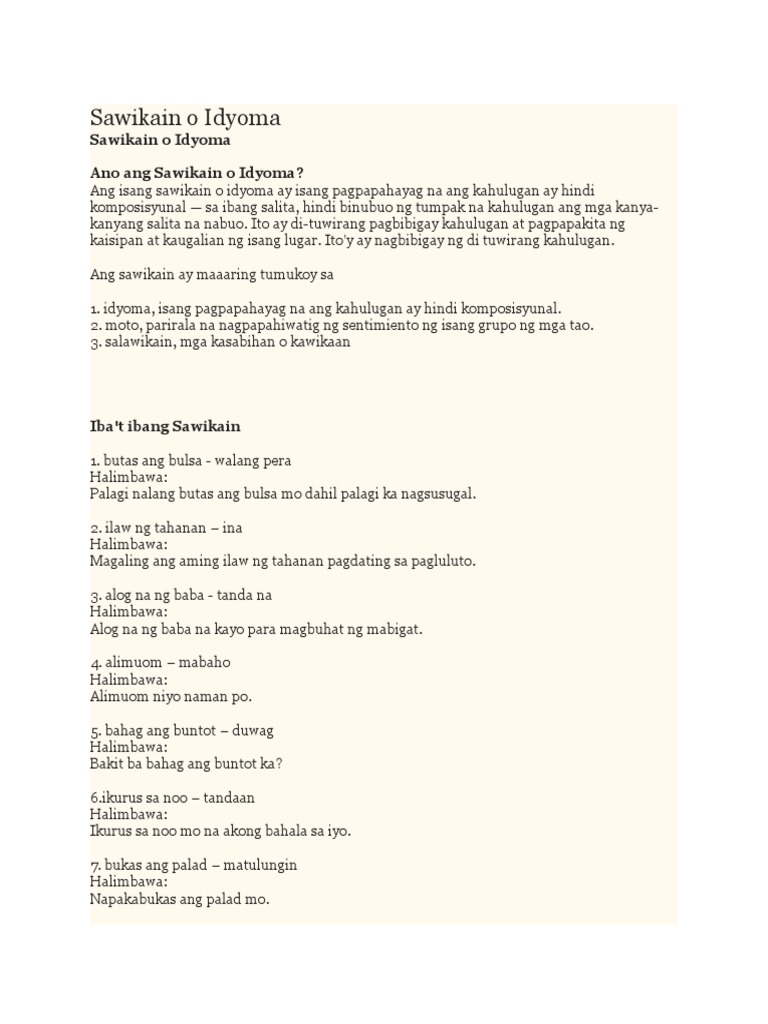Mga Halimbawa Ng Sawikain O Idyoma Docx Mga Halimbawa Ng Sawikain O Idyoma Iba T Ibang Sawikain 1 Butas Ang Bulsa Walang Pera Halimbawa Palagi Nalang Course Hero