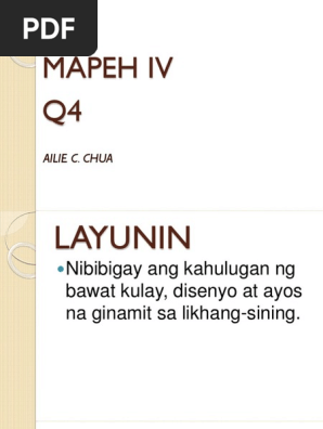 Ano nga ba ang sining. Ang kulay disenyo at pattern ng mga likhang-sining ng ibat ibang pamayanang kultural ay nababatay sa kanilang paniniwala tradisyon at kultura kaya dapat natin itong igalang at pahalagahan.