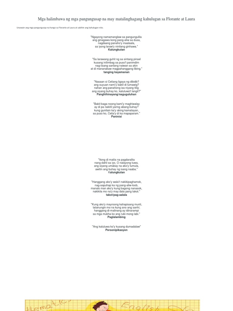 Mga Halimbawa Ng Mga Pangungusap Na May Matalinghagang Kahulugan Sa Florante At Laura