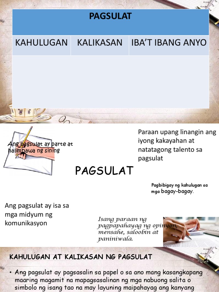 Ang pagsulat ay gawa ng isang manunulat o anumang pagpapahayag ng gamit ang mga letra ng alfabeto. Learn vocabulary terms and more with flashcards games and other study tools. Hideo Kitamura-Ang pagsulat ay pagsasalin sa papel o sa anumang kasangkapang maaaring magamit na mapagsasalinan ng mga nabuong salita simbolo at ilustrasyon ng isang tao o mga tao sa layuning maipahayag ang nasa kanyang kaisipan Sauco et al 1998-Isang paraan ng pagpapahayag ng mag saloobin damdamin at kaalaman ang.