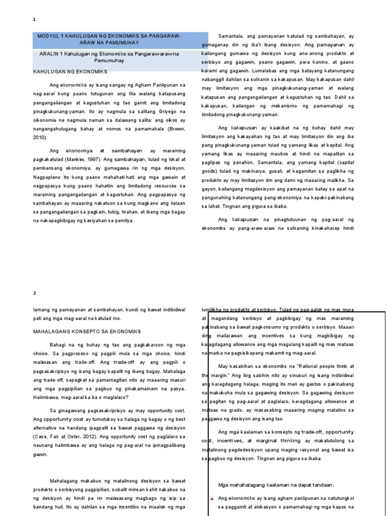 Ekonomiks 1st Q Docx Ekonomiks Ay Isang Sangay Ng Agham Panlipunan Na Nag Aaral Kung Paano Tutugunan Ang Tila Walang Katapusang Pangangailangan At Course Hero