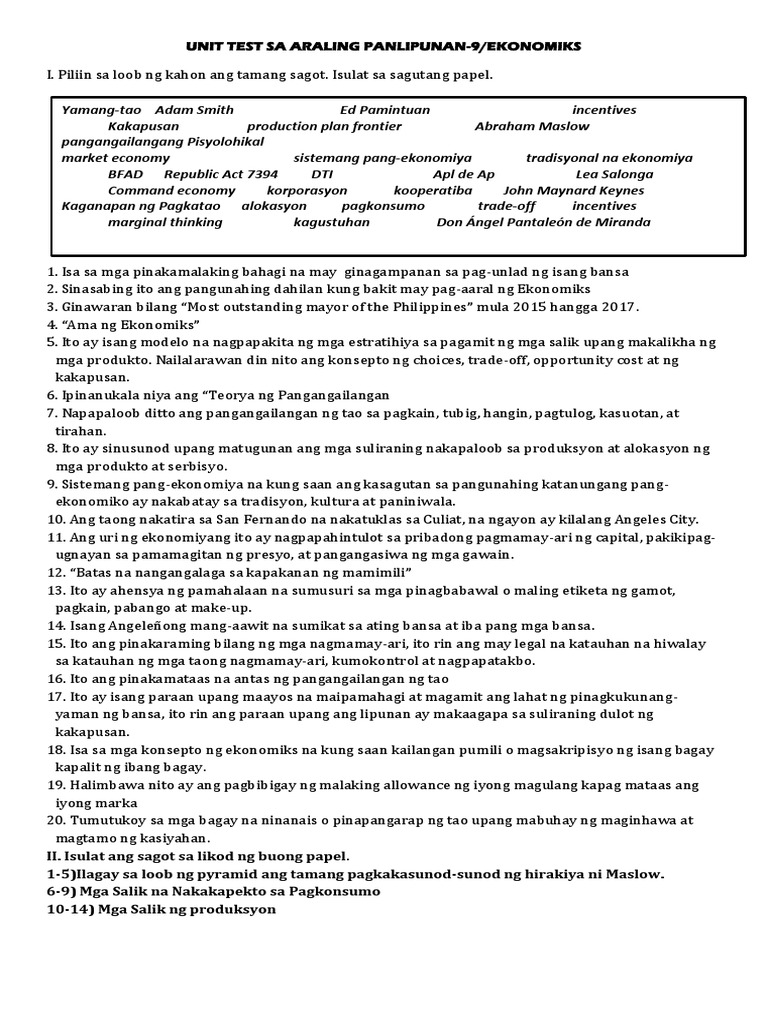Unit Test Sa Araling Panlipunan Docx