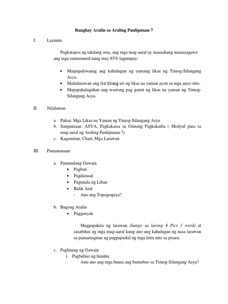 Lesson Plan For Araling Panlipunan Grade 7 Docx