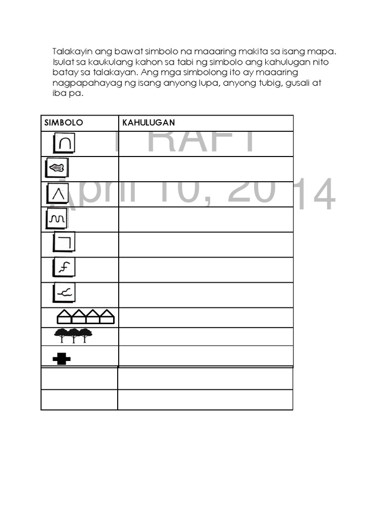 -Talampas -Bundok -Bulkan -Kapatagan at Lambak -Disyerto -Kapuluan -Tangway Anyong Tubig -Karagatan at Dagat -Ilog -Lawa -Golpo -Look. Ngayon sa paksang ito matutuklasan natin ang salitang-ugat ang kahulugan nito sa Hanay B. Ang mga simbolong ito ay maaaring nagpapahayag ng isang anyong lupa anyong tubig gusali at iba pa.