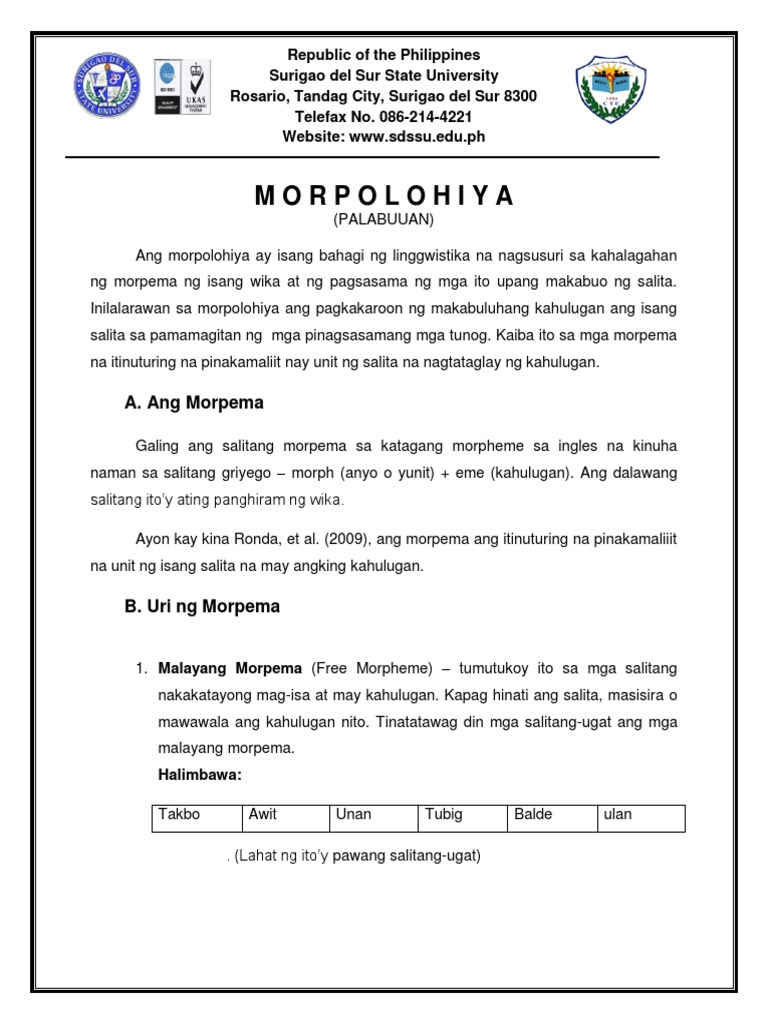MORPOLOHIYA pag-aaral ng morpema ng isang wika at napagsasama-sama ng mga ito upang makabuo nisang salita. Ang Morpolohiya at ang Morpema. ANYO NG MORPEMA Morpemang ponema o makabuluhang tunog-Ang morpemang ponema ay binubuo lamang ng ponemang o at a na may kahulugang taglay Morpemang salitang ugat-Maituturing itong malayang morpema dahil nakatatayong mag-isa.